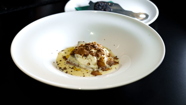 Tortellone con tuorlo fondente su crema di topinambur allo zafferano, nocciole, burro, scaglie di parmigiano 24 mesi e tartufo
