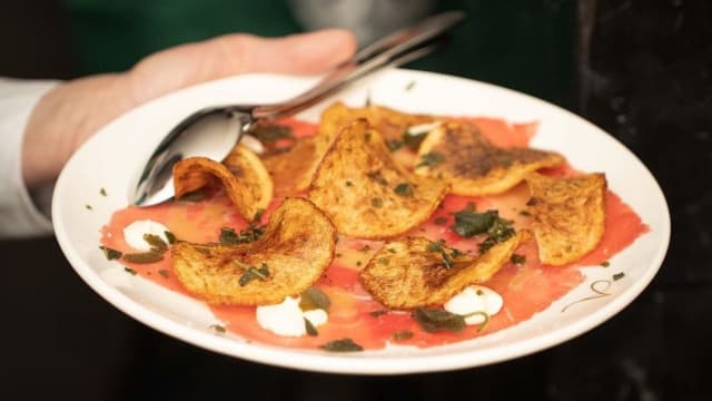 Carpaccio di manzo con crema di castelmagno, chips di patate e salvia croccante