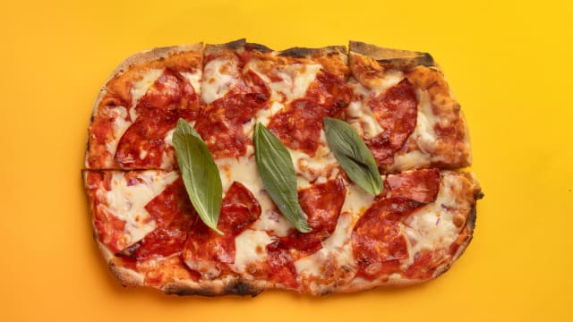 Molho de tomate, mozzarella fior di latte, cebola roxa, salame ventricina (picante) e manjericão