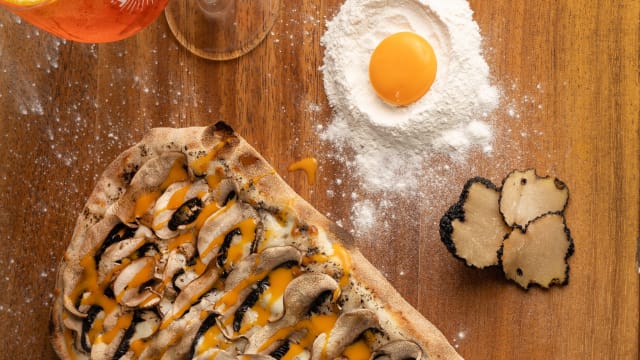 Molho de tomate, mozzarella fior di latte, cogumelo portobello, pancetta, alcachofra e azeitona preta