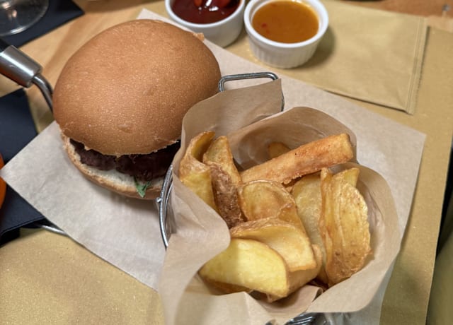 - Bun al sesamo, hamburger di vitello 150gr., pomodoro, cheddar, insalata, ketchup, maionese