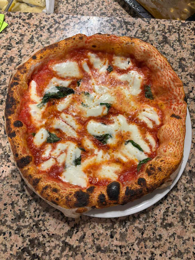 - Ombra di pomodoro san marzano schiacciato a mano, salsiccia napoletana a punta di coltello, grana padano dop, pepe nero in uscita: ciliegine di bufala dei monti lattari, scaglie di pecorino romano dop, basilico, olio d'oliva evo