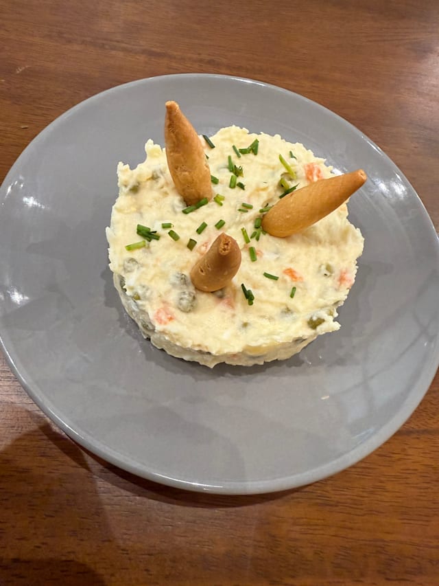 - Papa, zanahoria, atún, huevo, mayonesa y picatostes