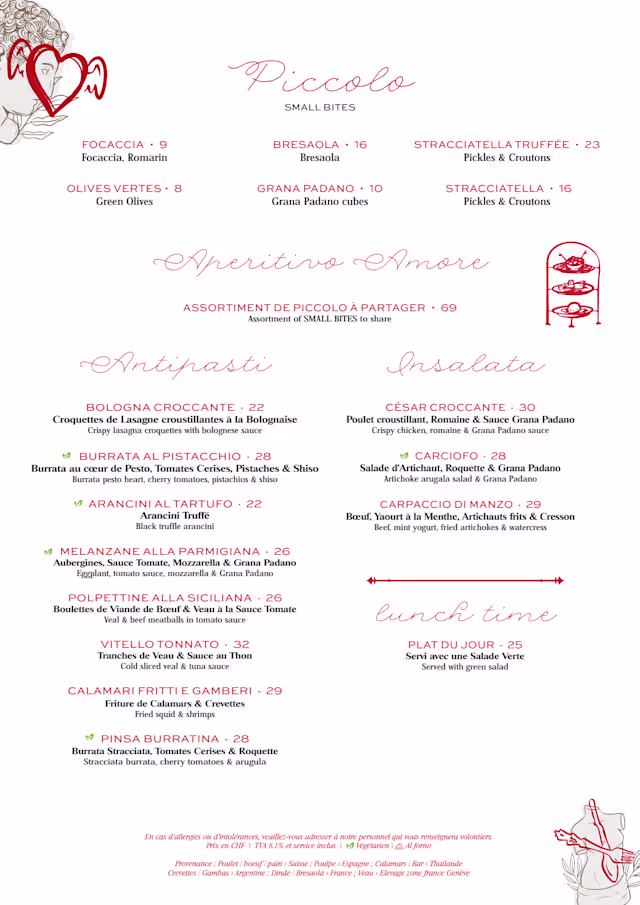 7/10Traveling from Canada and had 1 night in Geneva. Amore was on a list of top 10 restaurants in the city. The service was really nice but the food was not worth the cost. Pasta was insanely overpriced for how bland it was.