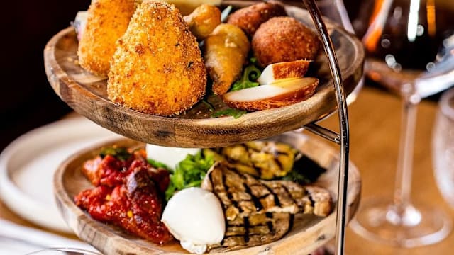 Assortiment de charcuterie italienne, fromages, légumes marinés, croquettes de parmesan et burrata.