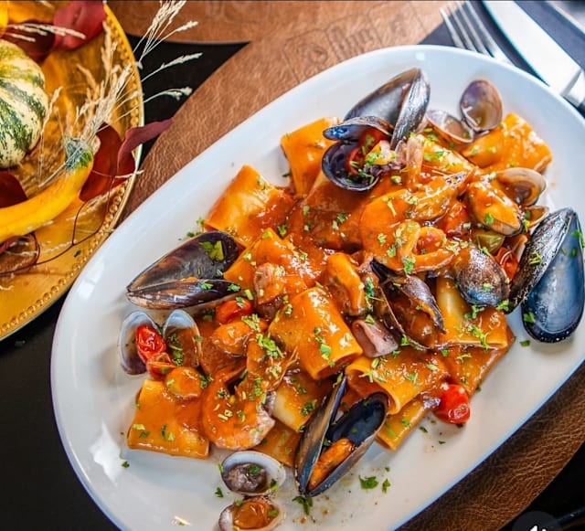 Spaghetti con mariscos frescos, calamares y gambas con un toque ligero de salsa
