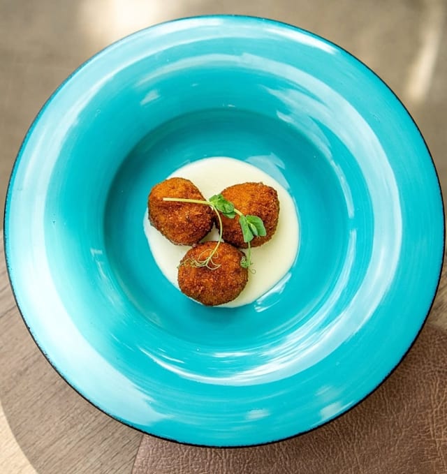 Crema de patata trufada, mozzarella, guanciale, alcachofas, huevo cbt, recubierta de ricota salada