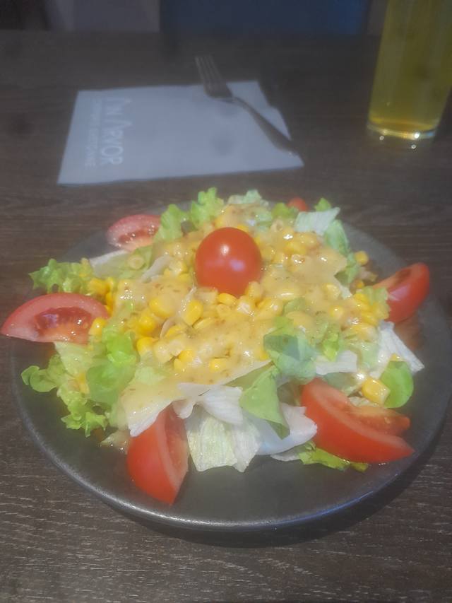 - Salade verte, tomates fraîches, toast (au sarrasin) de chèvre chaud, miel et brisures de noix