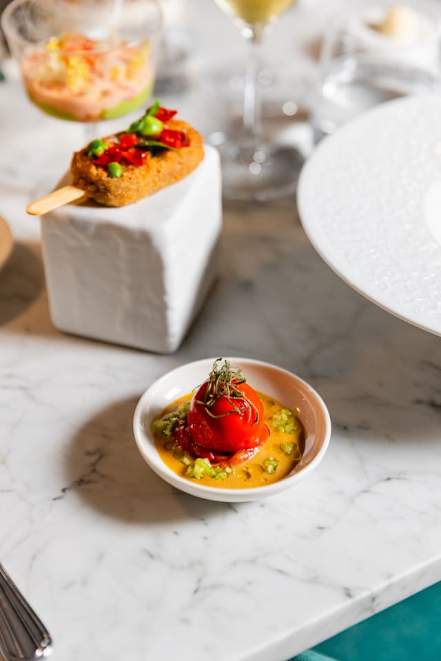 Prosciutto di pescato alle spezie mediterranee e gin analcolico, sfere di melone