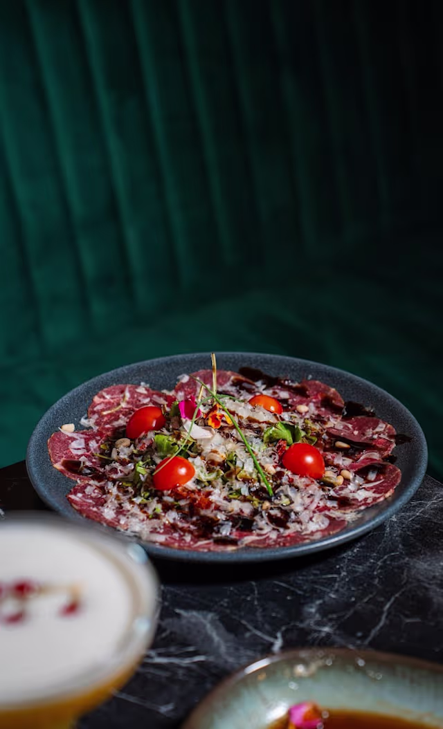 - Fine tranche de bœuf, burrata, parmesan, roquette, crème balsamique