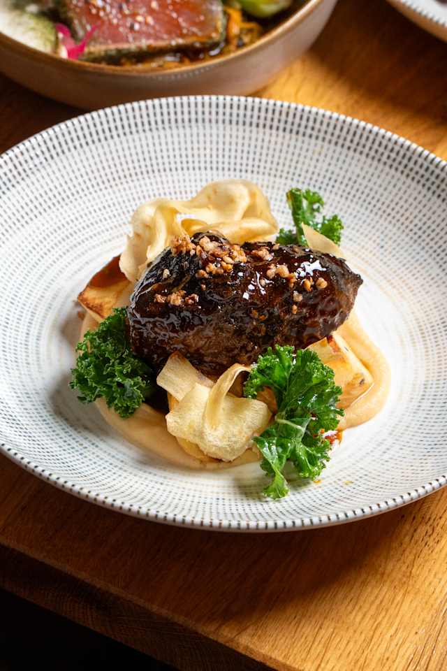 - Joue de Boeuf Braisée / Déclinaison de Panais Rôtis Ail & Romarin / Oignons Botte / Espuma Oignons Confits / Chou Khale / Jus de Cuisson Réduit Câpres-Cornichon-Estragon-Citron Confit