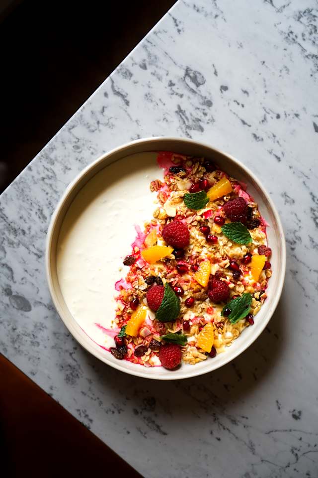 - Aubergine rôtie, yaourt battu, grenade fraîche, touche fumée