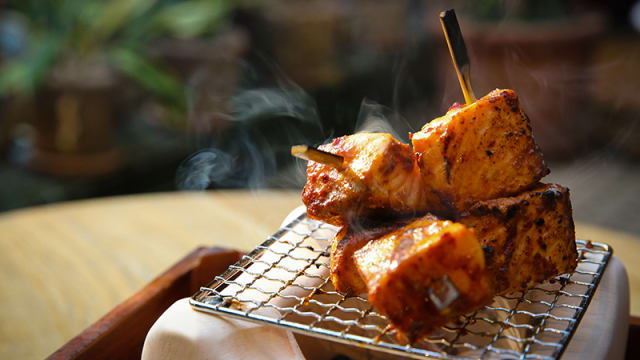 Brochettes de saumon marinées au mojo picon, fumées à table