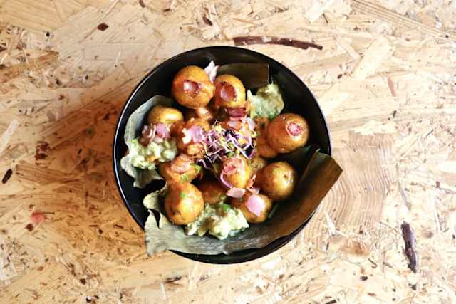 - Bravas. papitas criollas doraditas y crocanticas, bañadas con nuestra salsa brava de la casa, con ese picantico justo, servidas con tocineta crujiente y un toque de guacamole fresco.
