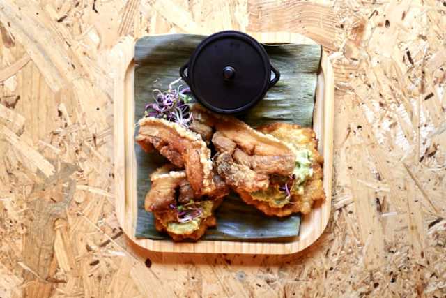 - Chicha rrones crocantes por fuera y jugositos por dentro, servidos con patacón y guacamole casero