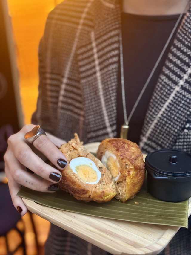 - Masa de yuca suave rellena de carne o pollo guisado con arroz y nuevo, doradila y lista para distrutar calentica.