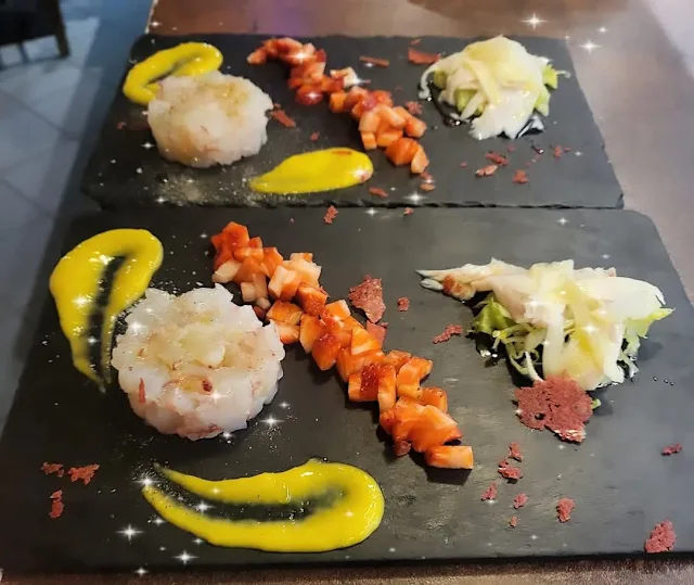 - Ravioli di gamberi, pistacchio, burro al lime, aglio