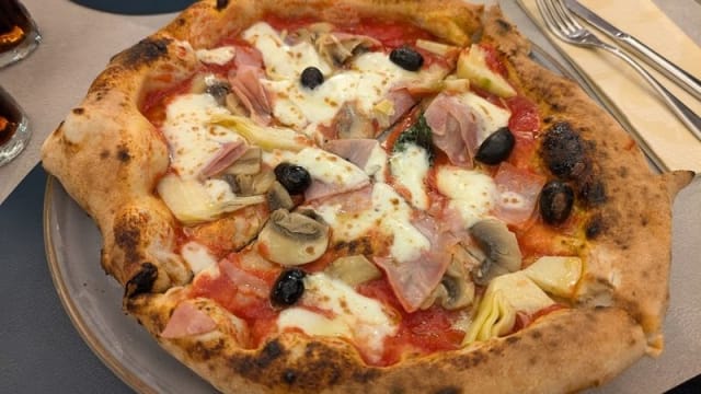 Pomodoro - salame dolce - nduja - stracciatella di bufala campana - olive nere - basilico - olio evo