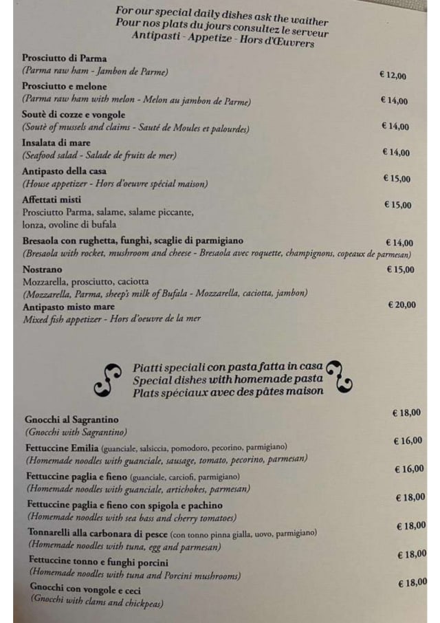 9/10Love the Italian food but I wanted something different tonight and ordered the filet with peppercorn sauce. Couldn't eat it. So tough and fatty. Gave it to my husband. Get a better cut of beef. 25 euros? Not worth it...
