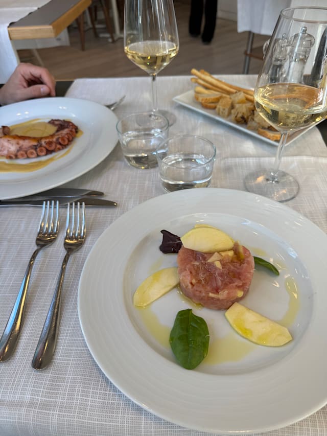 5.5/10Disappointing food on what looked like a good value tasting menu. Lowlight was a pasta dish that tasted actively unpleasant. Other dishes were ok but not exceptional- overcooked calamari, some slightly bland seafood ravioli, anchovies a burnt tarts tatin to finish. Nice staff who had to deal with an incredibly rude English customer. We ate better at a bar the same day with a 7 euro bowl of agnolotti. Not recommended….