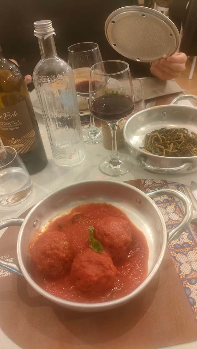 - Base di ragu’ napoletano cotto 8 ore, fiordilatte campano, polpettine di carne fritte in padella, fiocchi di ricotta di bufala campana e basilico fresco. Fuori forno, provolone del monaco di agerola DOP e olio EVO.