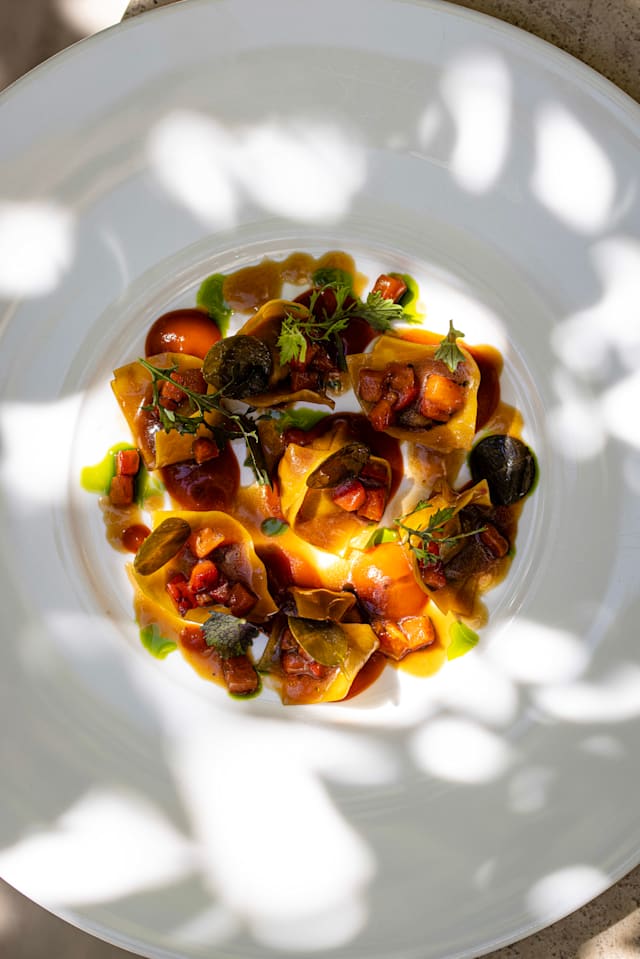 Tortelli di pollo alla cacciatora, funghi galletti, broccolo nero e foglie di capperi