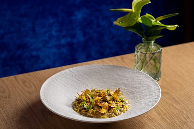 - Risotto con assoluto di carciofo “alla matticella” e tuorlo d’uovo marinato