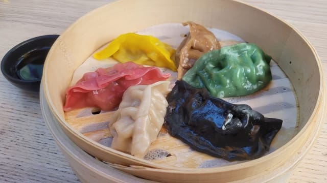 5 dim sum diferentes (gamba entero y cerdo iberico, ternera con pate de foie, jade de seta, gamba con cilantro, cerdo iberico con seta de cardo) 5 dimsum (whole…