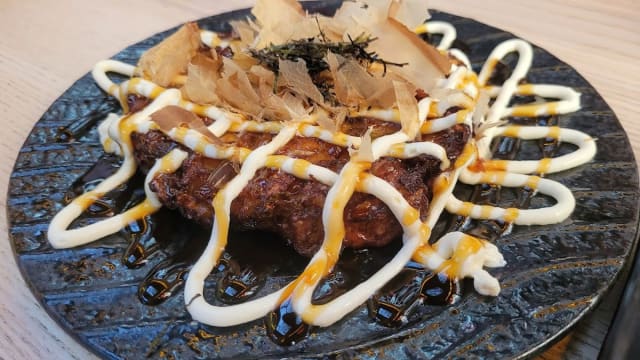 Croqueta de pulpo, servida con salsa okonomiyaki , salsa mayonesa, cebollino y copos de bonito (octopus croquette, served with okonomiyaki sauce, mayonnais