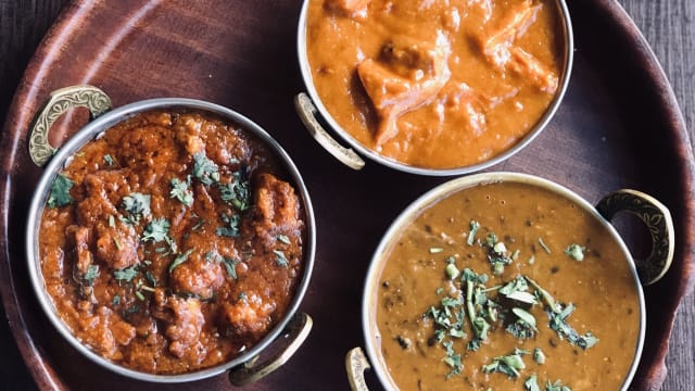 Gehakt gegrild in klei-oven bereid met curry masala, mango chutney en gemengde kruiden; licht heet en zoet