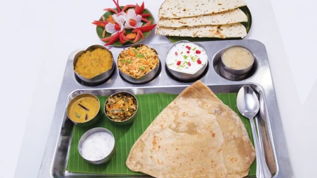 Soup [pulka / dhal fry / veg dry / days spl biriyani / veg curry / raitha / curd rice / day spl sweet / pappad / pickle] elaborate north indian style platter, consist of a delightful dishes, from appetizer to starter, main course to dessert, a complete & nutritional meal.