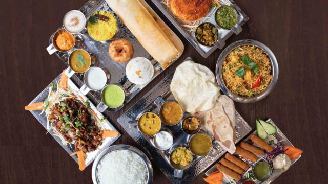 [day spl sweet / chapathi or poori with veg sagu / sambar rice / variety rice of the day / curd rice / appalam / poriyal pickle ] ideal indian style refined platter appropriate for business lunches, from appetizer to starter, main course to dessert.