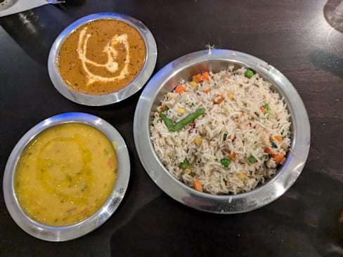 6.5/10Food was authentic. Every order however comes without bread, rice or pancaked. You cannot order seperate without a additional dish. We are used to bread as plate. Pancake as cutlery. Bread as napkin. Here it is different. They did offer us additional free rice but we could not share with strangers without pancakes. Our discount was not applied, only after discussion and to be met with no discount for our main order without prior notification. See photo for non discounted options. Drinks are 7,50 a piece. We opted for the bottled water at 3,50. Service was friendly but did not speak english or dutch. Most of our requests were met with no its not possible. All in all it seems a authentic indian kitchen. That will fill you with plain rice alongside small bowls of expensive options. Flavours are mild but good. Vegetarian only! Good deal with discount if not trying their recommended name-restaurant menu. I would come here again. If i wanted a bowl of rice with sauce options.