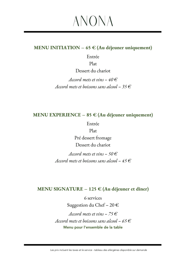 9.5/10I recently dined at Anona and loved the food and ambiance—worthy of its Michelin star. But I was a little surprised at the end when the server presented preset tipping options (10%, 20%, 30%) and asked something along the lines of ‘Anything for the team?’ where I had to re-clarify if he meant a tip. In a Michelin-starred restaurant in Paris, where service is already included, this felt a bit out of place. While I understand tipping customs can vary, in Paris — especially at this level — I expected a more discreet approach, given that service is already included. I mention this with respect — just as a guest who values the quiet elegance usually associated with this level of dining. Just a small note—otherwise, a wonderful afternoon.