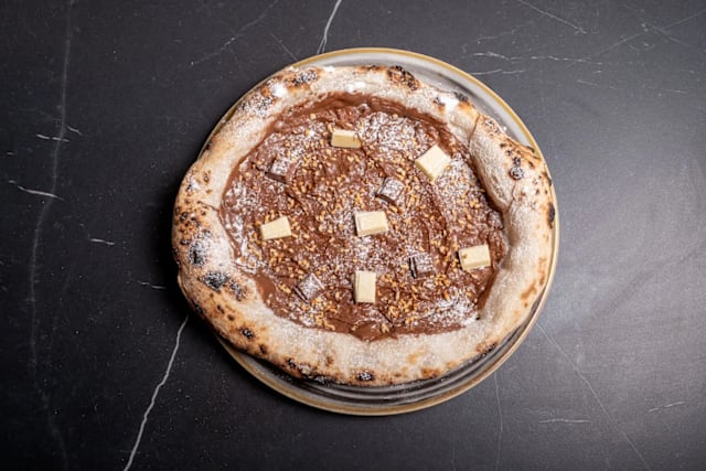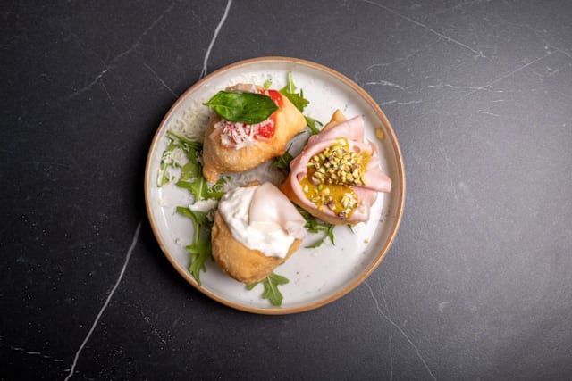 - Mozzarella fior di latte, prosciutto cotto di praga, crocchette di patate, fonduta di parmigiano reggiano, granella di pistacchio, basilico, olio evo