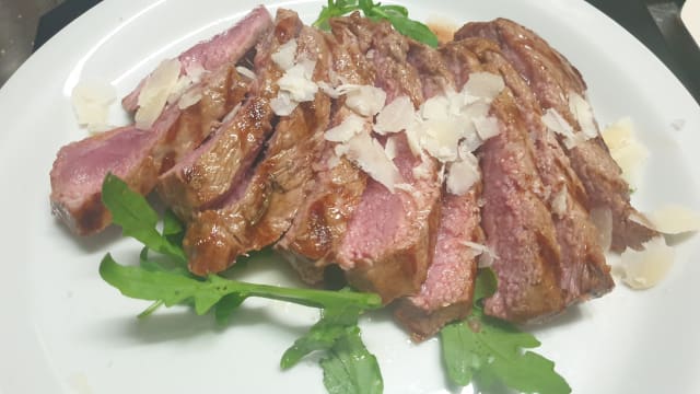 Tagliata di carne locale km 0 frollata oltre i 20 giorni al sale e rosmarino cotta su piastra ollare per mantenere sapori e morbidezza