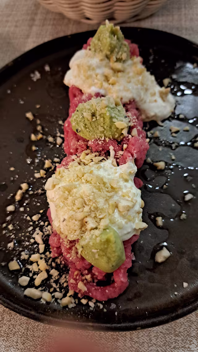 - Tartare di manzo con stracciatella, crema di avocado e anacardi salati