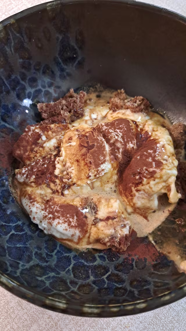 - Scomposto con crumble alla cannella, crema di mascarpone mousse al caramello salato e caffè amaro espresso