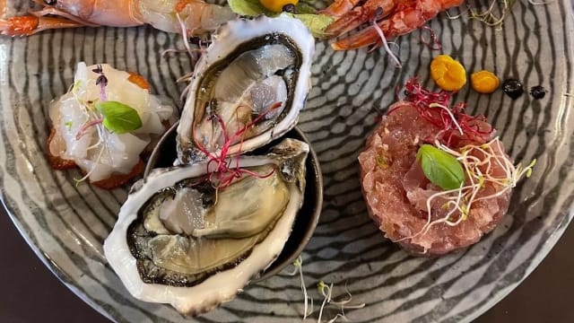 Tonno, scampi, ostrica, carpaccio di seppia e branzino, canocia, gambero rosso
