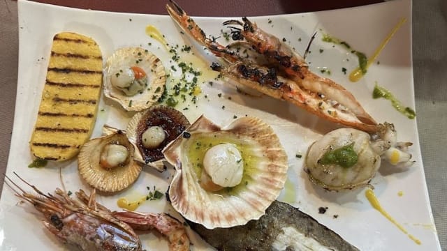 Store, capasanta, canocia, gamberone*, uova di seppia, seppia, moscardino, crostino con baccalà o dentice