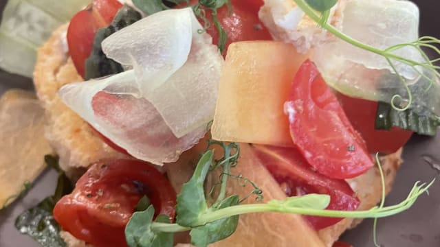 Crock di ricotta e pecorino con crema di piselli e gambero in tartare