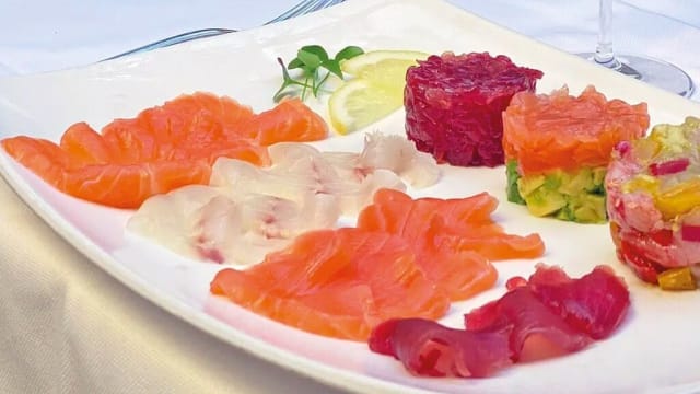 Crudità di mare con tartare di salmone selvaggio d'Alaska, carpacci di ricciola, tonno rosso, branzino, salmone selvaggio d'Alaska, gambero rosso, scampo, ostrica Special N° 2 Marennes-Oléron