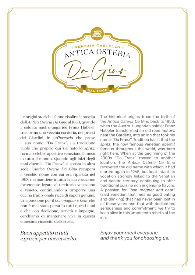 10/10We were most impressed with our lovely evening we had at Antica Osteria de Gino. It’s a lovely location, convenient, excellent food and a very lovely waiter who was so helpful. All in all a perfect place for a summer’s evening dinner. We will be back.