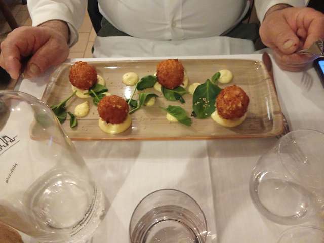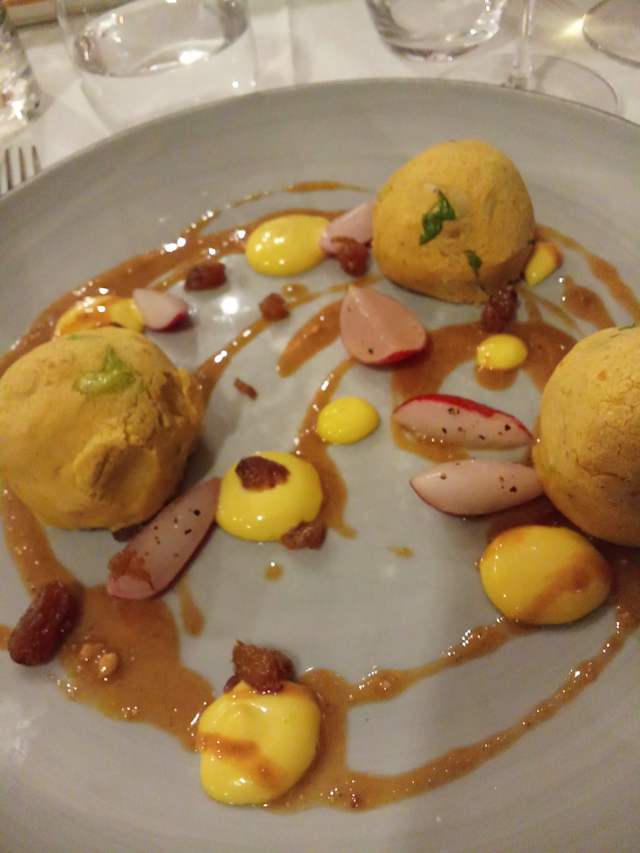 - Polpette di ceci e scarola, crema di pinoli, uvetta, ravanelli, maionese al wasabi.