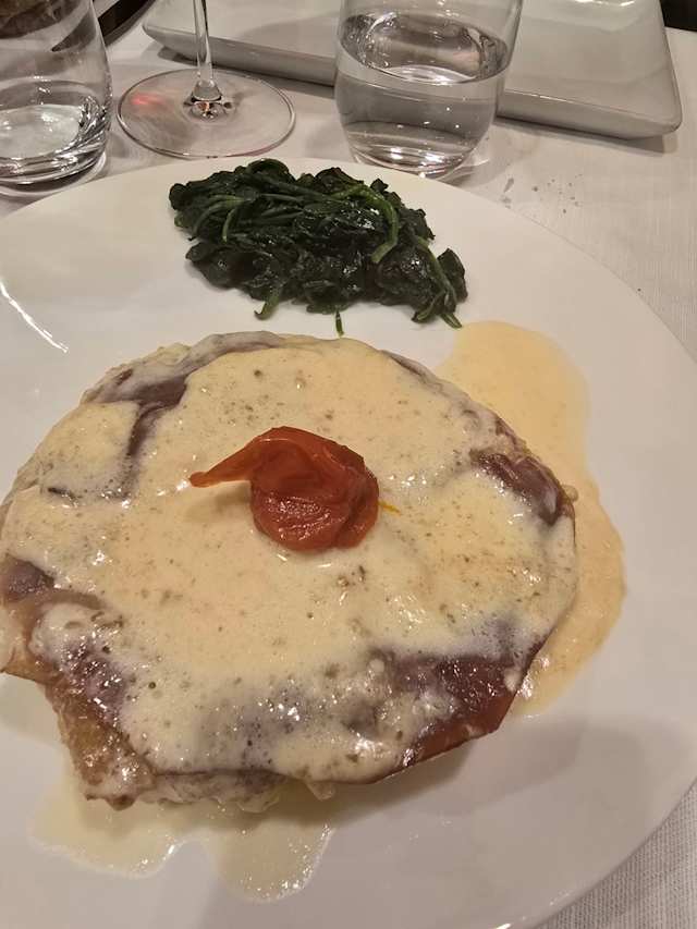 - Vitello, prosciutto di parma 24 m., parmigiano reggiano 24 m., spinacio saltato.