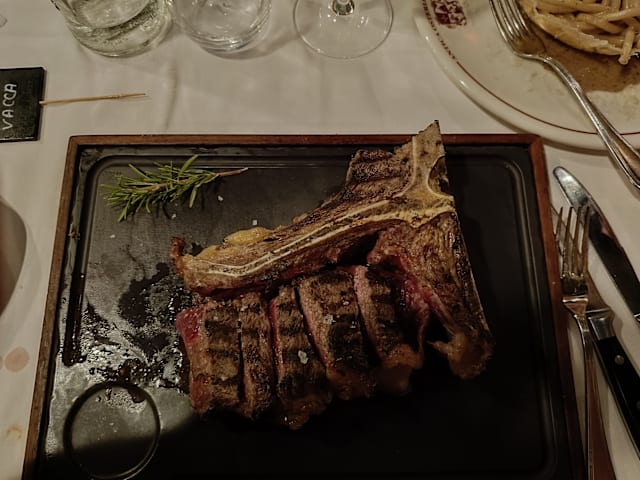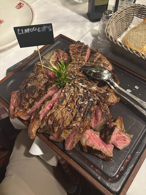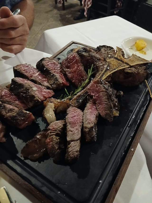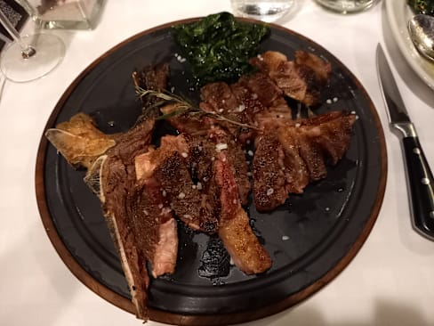 5.5/10Not exactly what it purports to be. The steak we ordered was supposed to be a t-bone. It looked more like a ribeye as the bone to which the meat was attached was curved and the t part was not obvious. The meat itself was very undercooked for medium rare: blood red except for an 1/8 “ on the top and bottom. There was no evidence that The top and bottom of the meat was seared at a high temperature. The meat was tender but not very flavorful, which was disappointing. The mixed salad was fresh and delicious as were the potatoes Al Forno. In our opinion, the steak was not worth the money or the trip.