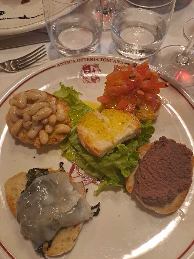 - Crostini misti con pomodoro, fegatini, cavolo nero e lardo, fagioli