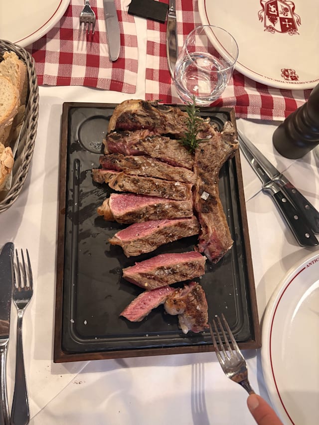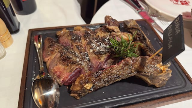 5.5/10Not exactly what it purports to be. The steak we ordered was supposed to be a t-bone. It looked more like a ribeye as the bone to which the meat was attached was curved and the t part was not obvious. The meat itself was very undercooked for medium rare: blood red except for an 1/8 “ on the top and bottom. There was no evidence that The top and bottom of the meat was seared at a high temperature. The meat was tender but not very flavorful, which was disappointing. The mixed salad was fresh and delicious as were the potatoes Al Forno. In our opinion, the steak was not worth the money or the trip.