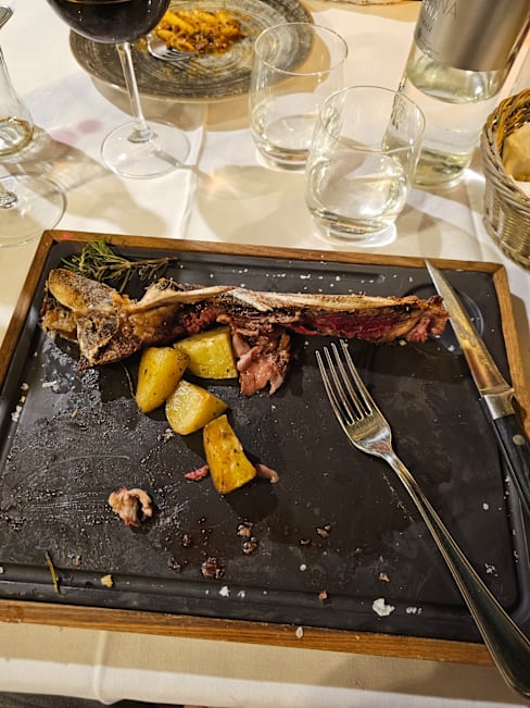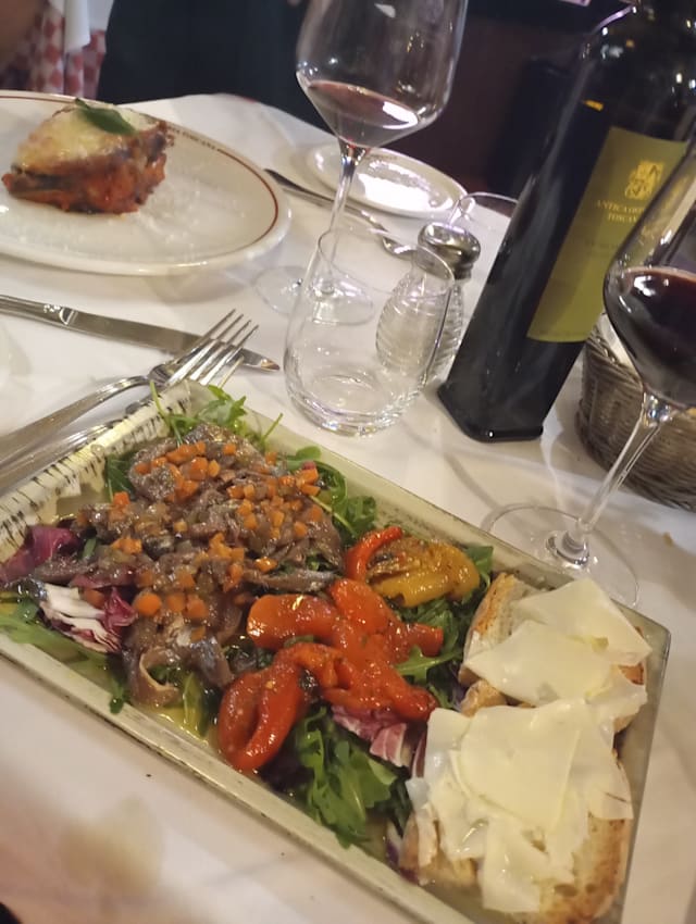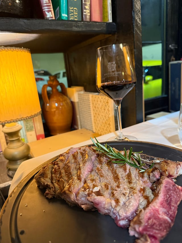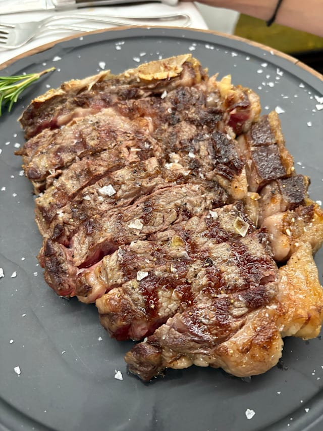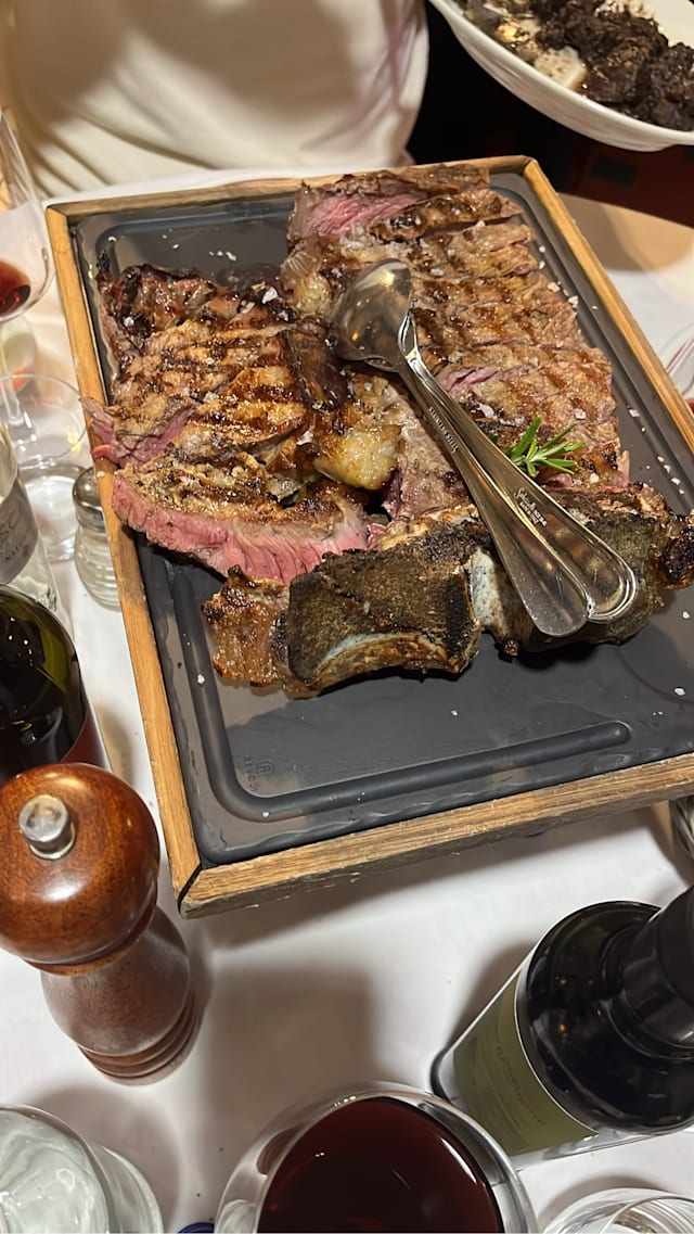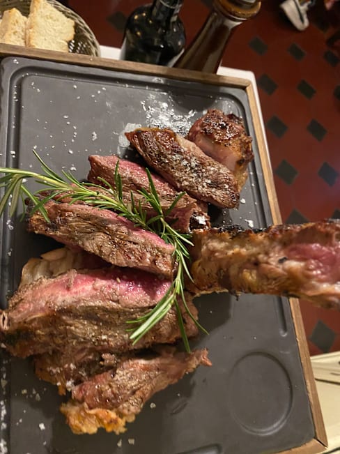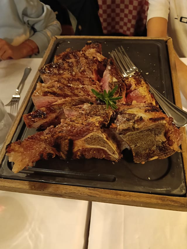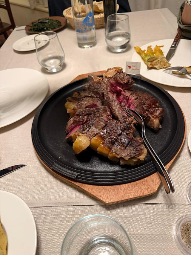 10/10Friendly, efficient and competent service - thanks to Adriano who was knowledgeable and could advise me so I ordered the perfect meal. This restaurant offers various traditional Tuscan dishes, but is renowned for it’s grilled steaks. The menu has Tbone steaks (1.5kg on average ) that are usually shared , fillet steak, and a tagliata from the sirloin (400g) ideal for one, however I’m sure they can adapt to the number of guests ordering steak. I took the tagliata. Where it gets intersting is the choice of the breed - ranging from Italian, Angus, Piedmontese, and so forth depending on the amount of marbling you like, flavour, etc. Truly exceptional quality. Started off with sliced raw artichokes with slivers of Parmigiano, dressed with lemon juice and an excellent olive oil. Took their thinly sliced crispy fried potatoes as a side dish. They were good but not outstanding - having said that, I spend a lot of time in Brussels and the Belgians make the best “frites” in the world… Good wine selection, half bottles too.