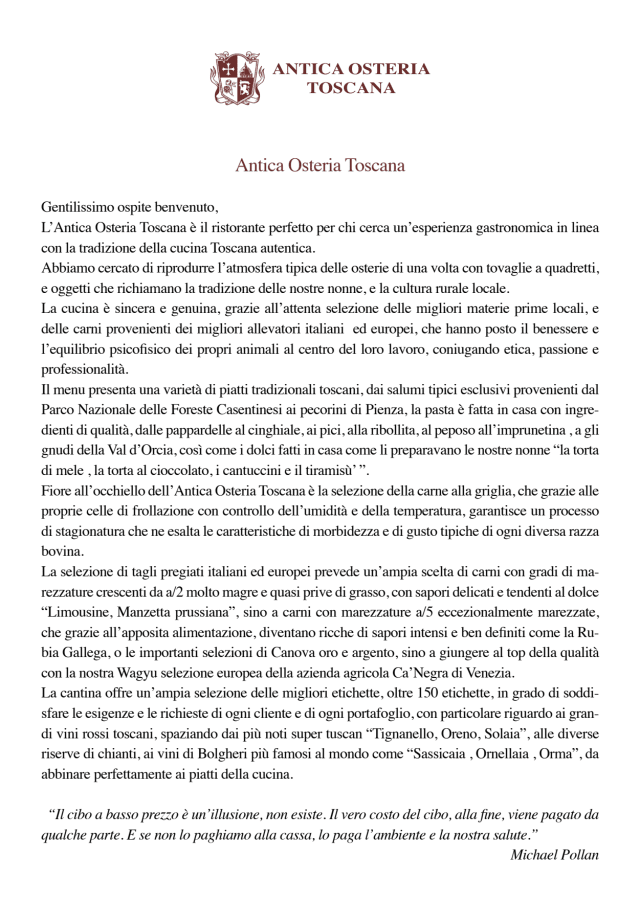 9.5/10We booked the restaurant because its online content said it was good. We weren't disappointed. The restaurant Antico was excellent. Great staff with good knowledge and absolutely fantastic steaks. Would highly recommend this to anyone in the Florence area.